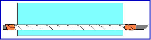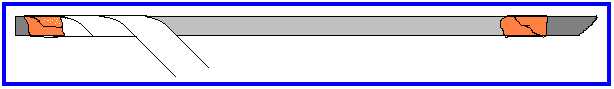 Secure both ends of the spiral with a bit more masking tape. Now cut a second piece of stock, 1-1/2" by about 5", coat with glue (or moisten if it is gummed stock); stick it to the back of the spiral wrap as shown below. Wrap the narrow bottom side up and around first, then with thumbs and forefingers, wrap the wide side down and around.  Of course, the glued or gummed side should be on the inside of this layer.