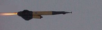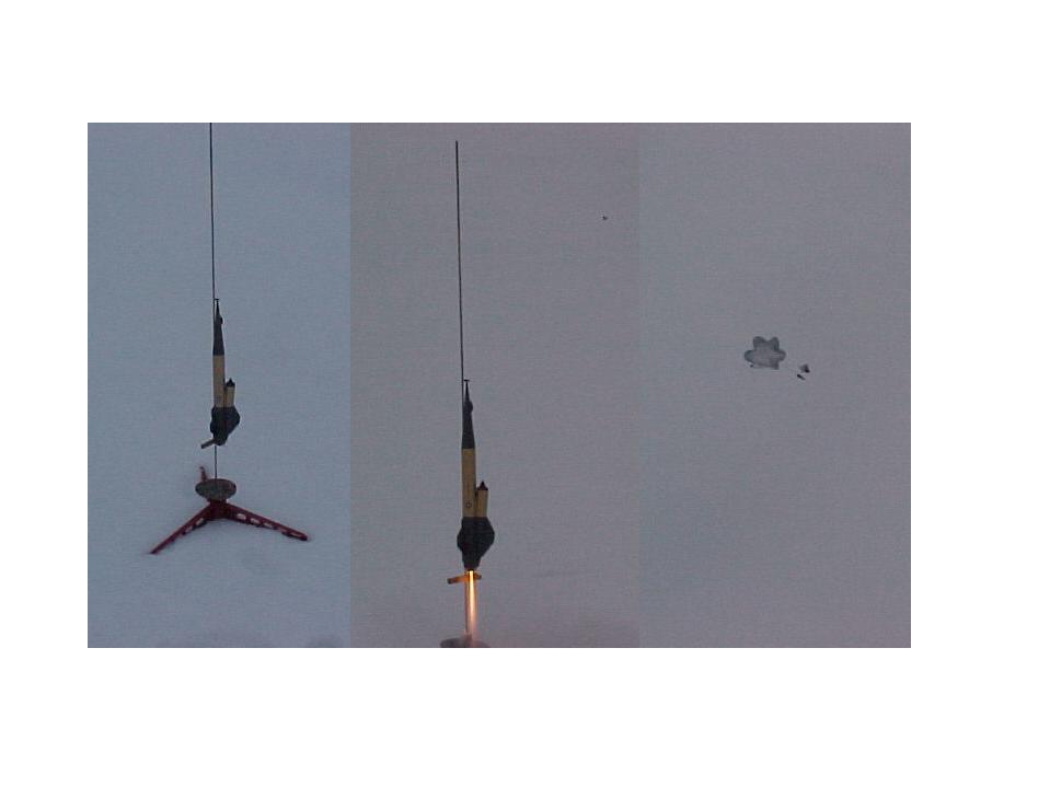 Boost was perfect—moderately slow and arrow straight to an altitude of about 300 feet. Ejection was right at apogee and the 24-inch mylar chute brought it to a soft landing in the snow 20 feet from the pad. The rocket was undamaged with only a few paint chips in the nose.