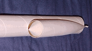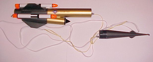 Stability is always an issue modeling guided missiles. They are meant to be moderately unstable to be able to maneuver. Compounding the problem in this case is an irregular shape. Bruce Levison kindly offered to model this in RockSim 7 for me. I ended up adding a total of 3.5 ounces of lead split shot and epoxy into the nose cone to ensure a safe, stable flight. Final weight of the rocket ready fopr flight without engine or boosters was just over 7 ounces and the CG was 8 inches from the nose. Based on Bruce’s simulations and my worst case modeling, this seemed about right.