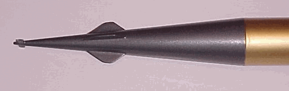 For the forward rudder and control surfaces on the nose, I made slits in the cone with a razor knife and mounted the thin styrene fins through the slots with plastic cement. I made these surfaces quite a bit smaller than scale, again to help with stability.
