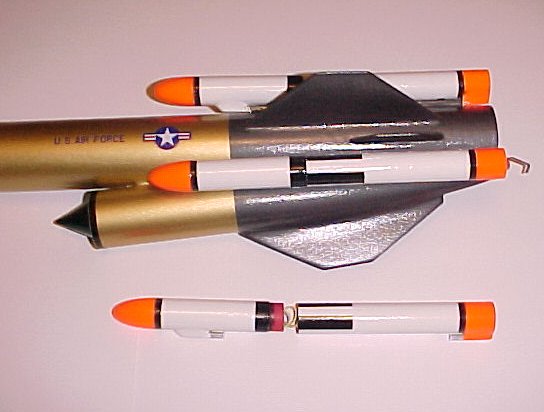 The ground launched version of the SLAM was to use three parallel boosters to get it up to speed prior to engaging the nuclear ram jet. I made the three functional boosters from BT-5 body tube and Mosquito-style plastic nose cones. The boosters separate about two-thirds of the way up upon ejection and separate from the sustainer. They use 18" of Kevlar™ thread as shock cord. They are attached to the sustainer using square aluminum stock. I used 1/8" stock on the side of the sustainer nesting into 3/16" square stock mounted to the boosters with 1/64" brass stock for a stand off. The square stock is nice because it allows a streamlined construction with no wobbling.