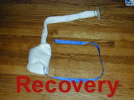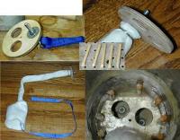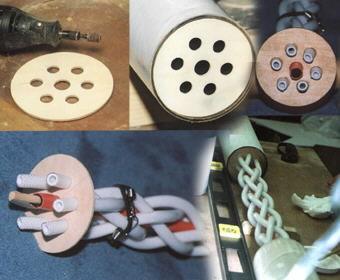 Two bulkheads are cut and holes are drilled as shown to accommodate the central compressor hose and surrounding faucet connection hoses.  The hose ends are roughened (to provide better bonding later) and inserted into one of the bulkheads.  A dowel rod may be inserted into the Central hose to provide rigidity during assembly.  The outer tubes are then woven around the central hose and inserted into the second bulkhead.  Length is adjusted to ~22 inches (bulkhead to bulkhead), excess hose cut off, ends roughened and both bulkheads are bonded to the hoses with epoxy.  After the epoxy cures, the bulkheads are carefully glued into the Recovery and Power Sections with ~0.25 inch recess.