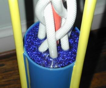 As a final touch, the recess was filled with tinted, glittering epoxy.  Blue glitter was washed with a 91% alcohol to remove the blue tint. A small volume of alcohol and a large amount of glitter produces the darkest tinting of the alcohol.  The alcohol was decanted from the glitter and added to a batch of mixed epoxy.  Fresh blue glitter was used to cover the bottom of the aft recess (in the Power Section) and the tinted epoxy was carefully poured over it.  Floating glitter was sunk with a pinpoint and the recess was uniformly filled to the brim by adding tinted epoxy drop wise with a disposable plastic dropper.  After curing, the same treatment was applied to the forward recess in the Recovery Section using red glitter.  A similar treatment was applied to the inner recess of the Nose Ball base.