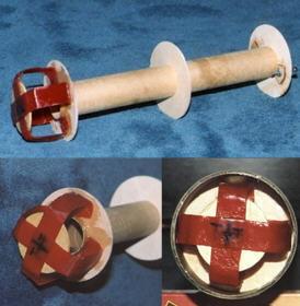 A third bulkhead is cut to the outside diameter of the BT (i.e. 4.25") plus a little extra to allow sanding to the precise final diameter. This bulkhead is glued concentric to one of the smaller bulkheads. A hole is drilled through these to fit the 3/8" Ball Pylon (dowel rod )