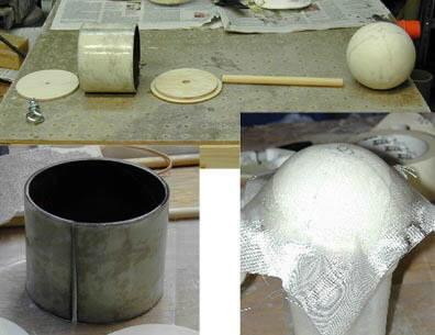 The Styrofoam ball surface is filled with lightweight spackling and sanded several times until smooth. The ball is then fiberglassed in sections using satin weave cloth. Further filling and sanding are followed with a coating of epoxy. A 3/8: hole is drilled true into the ball for the Pylon.
