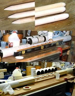 Struts are made from 0.5 inch dowels.  Forward ends are blunted and aft ends sharpened as shown.  The Struts are carefully positioned around the body sections with approximately 13 inches of attachment to each section.  A perfectly flat work surface is essential for this step.  Deep fillets are applied with thickened epoxy.  Two layers of fiberglass are applied across each attachment and the unattached section of each strut is wrapped with two layers of fiberglass.