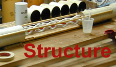 A segment of a three inch section of BT is removed to allow it to be inserted inside a BT section. Note cards and plastic food wrap are used to provide some slack in the fit and prevent bonding. A piece of fiberglass is laid up on the inside of the split ring and allowed to cure. The split ring is then removed from the BT section. Two bulkheads are cut from 1/8" ply to fit snugly inside the split ring. Using them to force the ring into a round cylinder, the outside of the ring is fiberglassed. The two bulkheads are removed.