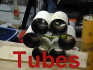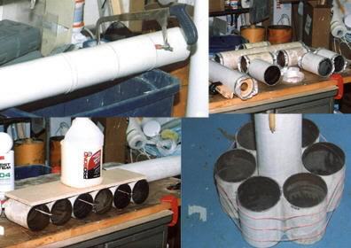 The outside of the tube is lightly sanded to remove the gloss, then cut to lengths and fiberglassed.  The tube fins are first siamesed, then attached together as a ring around the Power Section (but not bonded to the Power Section at this time.)  The ring of tubes is then removed from the Power Section and thoroughly filleted and fiberglassed together.  The ring can then later be bonded to the Power Section aligned to the struts with approximately one inch rearward offset to allow the model to stand upright with a motor loaded.  A brass or copper launch lug is positioned into one of the triangular gaps and fillets, foam and filler are used to fill the gaps.