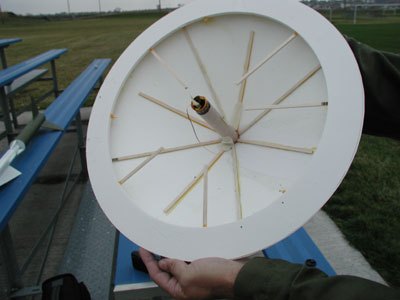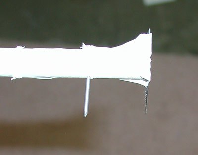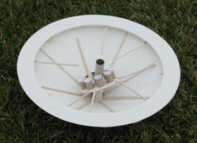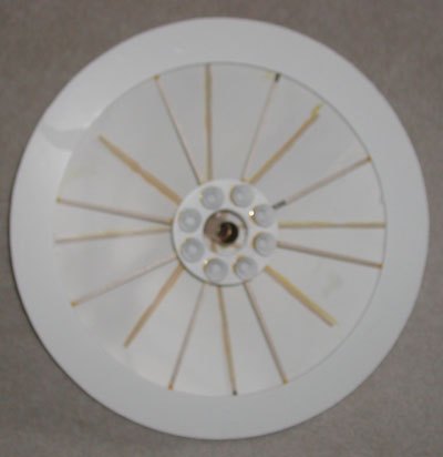 Next, I needed a ring of foam board to form the band around the bottom of the Aeroshell. The problem was how to cut an 18" diameter circle. After thinking on it for a bit, I hit on the idea of taping an X-Acto blade to the end of a dowel and using a small nail through the dowel as the pivot point. Since the circle needed is 18" in diameter, I drilled a hole at 9" and inserted a small nail. Poke the nail through the foam board and pivot the dowel, and a nice, easy circle is cut. This method works best if you cut through the board in three or more passes. Go any faster and the X-Acto blade tends to hang up. Once the outer circle was cut, I then cut an inner circle 14 3/8" in diameter. The inner circle was set aside, leaving an ring of the proper diameter to form the base of the Aeroshell.