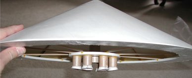 The original PEPP Aeroshell is 180" in diameter and 55" tall. While a full-scale version would've been really, really cool, I thought it a bit excessive. So, I took the lazy way out and went with 1:10, which means the base of the Aeroshell is 18" and the cone is 5.5" tall. The first step is to download a copy of VCP and print out the six-page template to create the cone. The template pieces were cut out and rubber cemented to posterboard, in their proper positions. Cut out the template and glue it together. I used a strip of standard copier paper to form the seam in the cone.