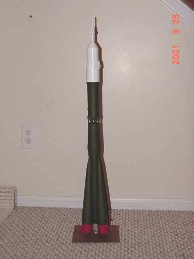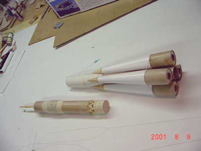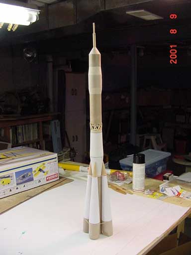 Here's a sneak peek at the Soyuz currently under construction in my workshop. The model is a 1/69 scale representation of the venerable Soviet space booster. All the nose cones and balsa transitions were made by BMS. The paper transitions and shrouds were made using VCP's transition pattern tool.