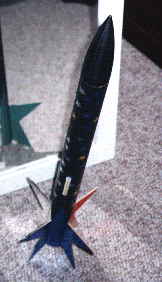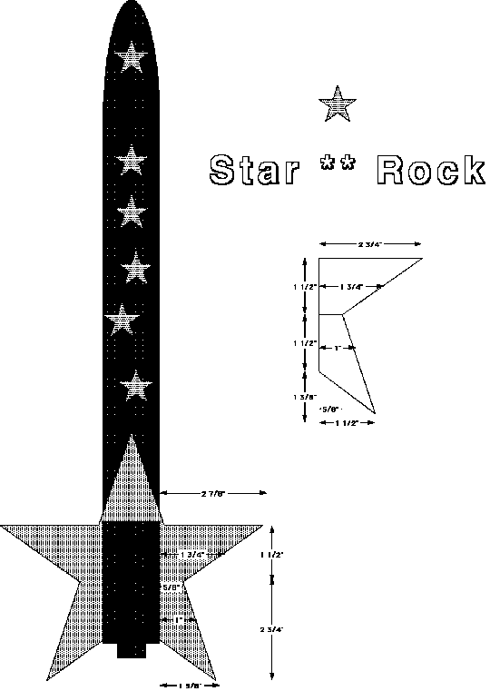 The original version uses a full 18inch piece of BT-60 (about 1.6 inches) body tube, with "your choice" of nosecone.  Fins were lite-ply (? the three layer stuff you get in grab-bags) in an attempt to preserve the points of the stars.  The paint scheme calls for painting the fifth point of the star going up the body tube.  the measurements shown give you a correctly proportioned star looking perpendicular to the plane of the fins (there are four fins), but a possible modification would be to stretch the horizontal dimensions so that the star is proportioned correctly looking directly between two adjacent sets of fins, which is the way the prototype was painted (much easier that way!)  Motor mount is a conventional mount for 18mm motors.  Stability was verified with VCP using subsets of the fin segments (which aren't just about perfect (weight and drag wise, this model is very similar to a big bertha.)  Fly with an 18inch chute, depending on wind and how soft your field is.