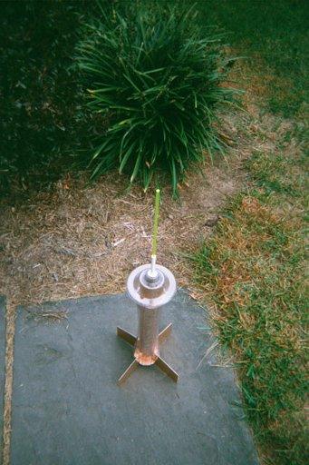 For the nose cone assembly, I made a plywood bulkhead and inserted an eyebolt. I found that the cardboard core from a used roll of electrical tape fit nicely into the 38mm tubing, so that became the nose cone's shoulder. I then needed something to fashion a spire for the top of the tower. After much scrounging, I found a plastic plug that fit tightly into the top of the daquiri glass. I also grabbed a section of plastic tubing (originally bought as launch lug stock) that fit over the end of the eyebolt. I drilled the plug so the tubing fit through and slid these into the front of the nose. Finally, I cut a hole in the nose cone's shell for the launch rod to pass through.