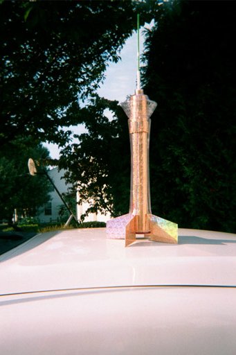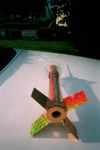 I thought and thought about finishing. Should I paint the components and leave the shell clear? Or, should I paint the shell from the inside? While wandering the aisles in a craft store, I noticed some self-adhesive holographic film and decided that was it. I covered all of the inner tubes and the fins with the film and re-inserted them into the clear outer shell. As a final touch, I bought a small, neon green, see-thru plastic rod that fit nicely into the end of the plastic tube mentioned above. This is interesting looking stuff. It catches ambient light and its tip appears to be lit up - an effect that is somewhat similar to optical fibers. I think this effect is visible in the pic to the right.