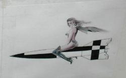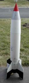 I wanted a bit more decoration on this version so I decided on a pattern similar to a real V2. I looked in ROTW and came up with a hybrid marking scheme. The tail section has a black and white roll pattern, the nose cone is red, and the transition section directly below the nose is painted silver (Krylon hammered silver). Since most of the rocket is poster material, I decided to mark the fins using a large permanent black marker. Finally, I added some text and graphics from my ink jet printer. Inspired by the early V2's fired from White Sands, I created a 'cheesecake' style graphic of a girl riding a V2. And, in a feeble attempt at humor, I also added two labels written in German. One identifies the bar code sticker, which unintentionally remained on the body (oops), and the other tells the launch technician where to install the launch rail.