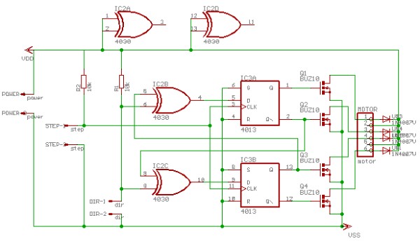 Here is a simple stepper motor driver schematics. It uses simple, easy to find IC and can be built on a striped board.