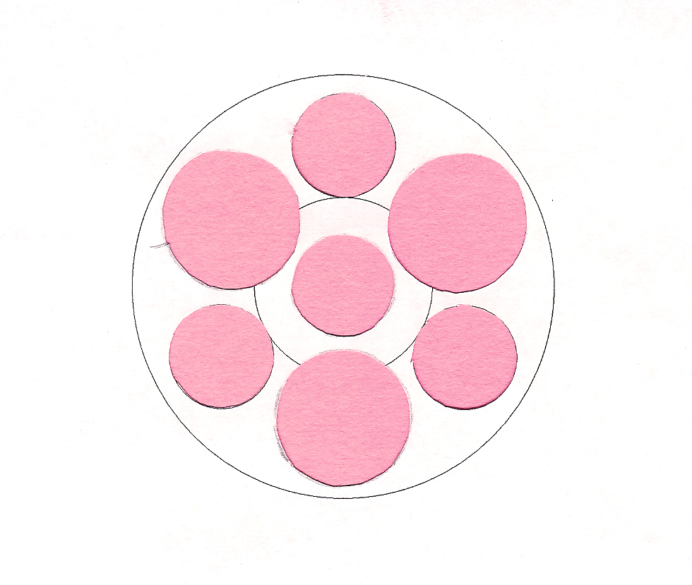 Building the centering rings took an entire week of hard work. The geometry of the rear ring was too tough for me so I used the following approach. With online and downloadable tools, I designed a non-beveled cluster centering ring by drawing three simpler versions and taping them on top of each other. These simpler starting points were patterns for 3 x 18mm, 3 x 24mm, and a central 18mm. Tracing these together I formed the round version.