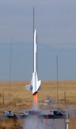 We found a 5 foot long 1/4 inch rod, loaded the rocket and attached all the igniters. With all the wiring cascading out the aft end, the rocket looked pretty formidable on the pad. 5-4-3-2-1-liftoff! The flight was incredible. The rocket slowly climbed up the rail and gradually gained speed, giving spectators quite a show at low altitude. The velocity and noise increased until the rocket was tearing through the sky and it was virtually out of sight. RockSim predicted an altitude of 1993 feet.