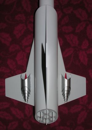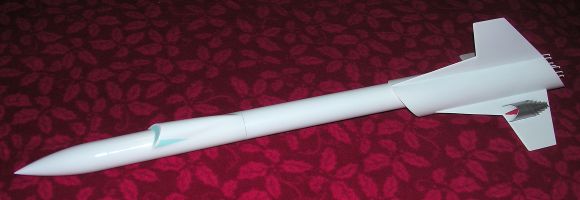 My model needed 3oz of melted lead in the nose for stability. The center of pressure for my rocket is a bit forward of the joint between the upper fin and the corresponding strake. Get the fully loaded balancing point at least 3 or 4 inches forward of the CP. Glue on the nose cone.