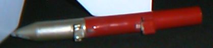 Cut about 5mm off the front end of a spent 18mm casing (maybe the same one which donated the coupler). This will be the booster's motor block. Take 450mm of Kevlar thread and tie it round the motor block, then glue the motor block 65mm into the rear tube. (You can use another spent 18mm casing to position it. Put a mark 5mm from the rear end of the casing, then use the casing to push the motor block into the booster's rear tube. When the mark is level with the end of the tube, stop pushing and remove the motor casing.) Pass the free end of the Kevlar through the coupler and right through the front tube, tie it onto a nose-cone, then glue the nose-cone into the front tube.