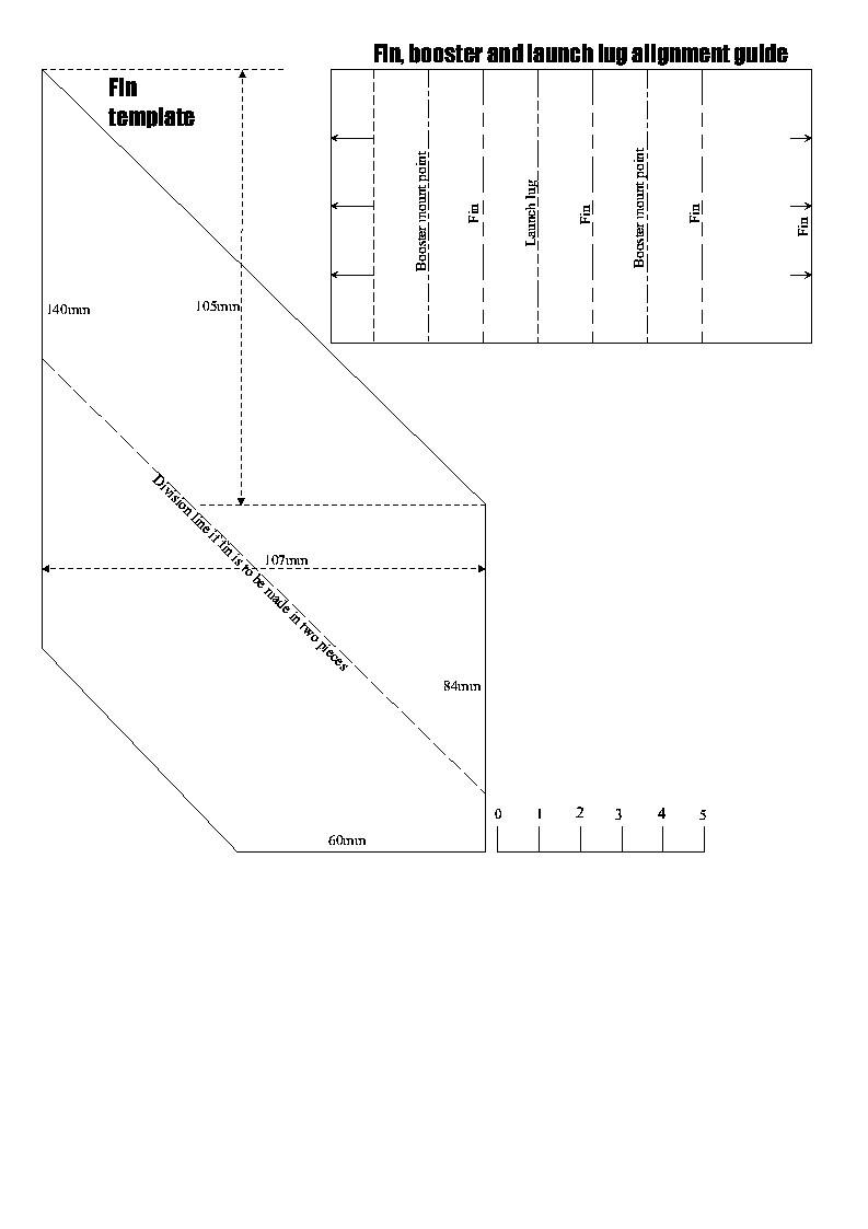 A scale of 5cm is provided. If you can get this to print out to the correct size, you can cut out the fin and alignment templates. If not, the diagram shows the sizes of the fin's root, tip and trailing edges, as well as the leading edge sweep.