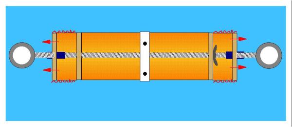 Notes: The eyebolts extend 1/2" into the coupler nuts. The all thread rod goes in to the middle from the other direction. The red squiggly lines represent the bonded area. Epoxy is smeared on the inside surface of the BT to bond only the area shown. The left hand (brown) bulkhead on the AB is bonded on. The one on the opposite end is removable and held in place with a wing nut. The end bulkheads are perforated with 1/4 or 3/8 inch holes to allow the ejection charge to pressurize the appropriate area (arrows).