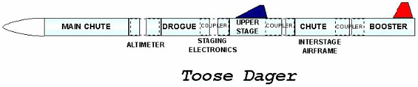 Toose Dager is a 2-stage rocket design which incorporates all of the latest technology and special features that are seen on the flying range today. From the staging timer mounted in the sustainer to the tubular nylon and high quality Rocketman parachutes the Toose Dager is designed to perform and last. The parts list is complete except for the electronics package. There are many brands of altimeters and timers on the market today and any combination of them can be used. Most will fit into a standard 3inch airframe 6 inches long.