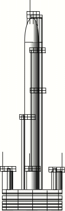 - Simulate a catwalk by gluing a crown of styrene rods to the end of the nose cone, and add some horizontal rails around this crown. A longer lightning rod can also be added. Add similar overhead draws, but without the horizontal section, to each of the reboilers (tube fins), making sure to keep them inboard of where the tail ring will be.