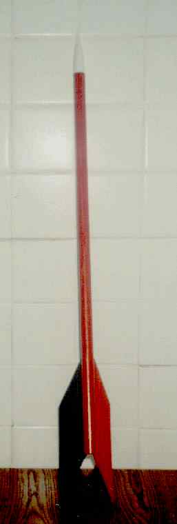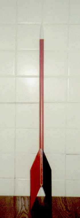 My rocket was complete. Now I needed a highly visible finish. I colored it with Magnum 44 permanent markers -- body and one fin red, for visibility, and the other fin black, so I could easily see if the rocket spun on its way up. I left the nose cone white because I thought it looked cool.