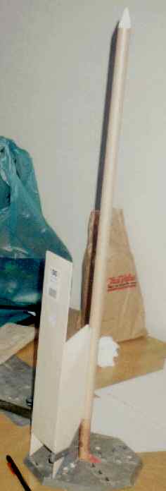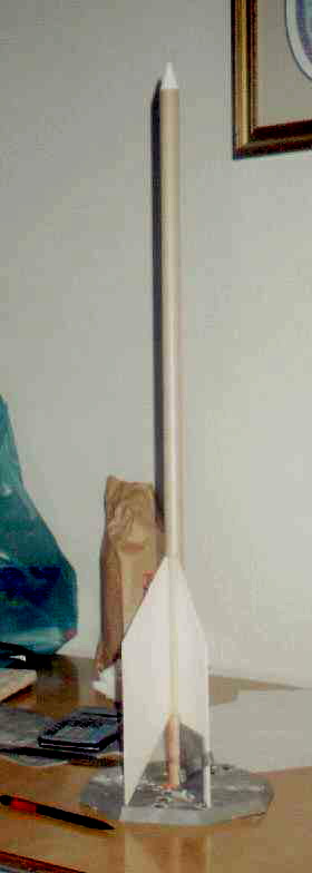 Building the rocket was straightforward; I used mainly conventional techniques. I used a 24" length of 18 mm body tube, because that was the longest piece I had on hand. I used a long NC-20 nose cone to allow plenty of room for nose weight. I added half an ounce of clay, which almost completely filled the nose cone, then I glued the base in place with plastic model cement. I cut the fins with the grain parallel to the root edge because I couldn't find any balsa sheet large enough to lay them out any other way.