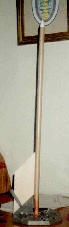 Per the NAR Model Rocket Safety Code, I tried to determine stability before flying it. I did a swing test, and it appeared quite stable. Just to be on the safe side, (and to avoid embarrassment if anything went wrong) I conducted the first test flight in complete isolation from persons not participating in the actual launching. I did bring my wife, so I'd have another witness to confirm that the rocket had made a stable flight. I had already been appointed RSO of the next club launch, and I wanted to fly the model there. I anticipated having some difficulty convincing certain members that I should be allowed to fly it.