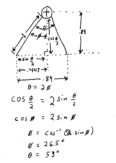 I predicted that the optimum angle would be the one that presented the greatest minimum lateral area. That is to say, position the fins so that, if you turn the rocket so the least fin area is visible, you have the most visible area left. If you put the fins opposite each other, and turn the rocket so the least fin area is visible, you are looking at a fin edge-on, for practically zero area. As you reduce the angle between the fins, the minimum area increases to a point, then decreases until, as the fins become nearly parallel, the minimum area again approaches zero. I calculated that the "maximum minimum" area would be found when the angle between the fins, theta, was such that cos theta=2 sin theta. So theta should equal the arc cosine of twice the sine of theta, or 53 degrees. (See sketch.)