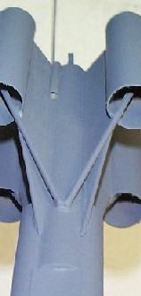 top view of canopy and anti-matter pipes 19. Two options on a pilot canopy: a) Fabricate a pilot canopy using paper from the Gemini DC instruction sheet using a known pattern or design one of your own scale. Glue it in an appropriate location on the "top" of the front section. b) (heavier but still acceptable of two options) The PNC-50 nose cone could also be used for this purpose if cut down in size somewhat on a jigsaw or small band saw. Place the two halves end to end on the "top" of the front section, and glue in place. This is the option exercised on this model.