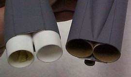 12. Mark several 0.75" strips down the long length of the back of the card stock that comes in the Gemini DC package. Cut them out with scissors. Measure and cut two pieces to cover the two exposed tubes of the front section. Lightly glue the strips to each side of the front section. Note that too much wood glue could cause the card stock to wrinkle as the glue dries and shrinks. Cut out two more pieces of card stock and lightly glue them on top of the first two flat pieces. Construction of the nose section will be done in following steps.