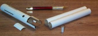 1. From the Gemini kit, find the small one inch long cardboard tube. Cut off a small portion about 0.25" long. The shorter piece will be used to equalize pressure between the two BT-20 body tubes (and fill in the holes on the sides of these body tubes that are used by the Gemini DC kit to port ejection gases from the main tube to the side tubes) on the front section of the rocket body. The longer portion will be attached later to simulate the laser weapon.