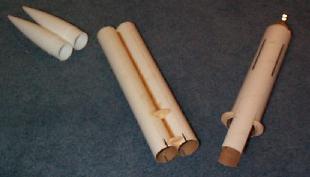 13. Install the two PNC-20 nose cones into the two tubes of the front section. Carefully glue the two nose cones together by putting a dab of CA in the joint where the two nose cones touch each other. (Do not let any CA run back to the joint of the nose cones with the front section, or you will have to figure out another method of recovery other than parachute since both ends of the rocket will be glued shut!) If you have to pull them out slightly to avoid getting CA on the cardboard tubes of the front section, be careful not to change the parallel orientation of the cones to each other along their centerlines. After the CA cures, reinforce this joint with epoxy.