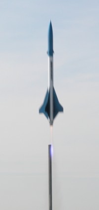 Danny recommends a variety of G motors for this kit. The motor I used is not on his list but turned out to be a wonderful match for this kit. I used an Aerotech G-104. It is a Blue Thunder formulation, with very little smoke and a blue flame. I used a Kevlar® chute pad so there was no wadding required. The motor was retained with a homemade ring that fits below the bottom of the motor and uses two screws into the supplied blind nuts in the back centering ring. The Mini-Armageddon came off the rail straight as an arrow and flew to apogee very straight. The medium delay on the G-104 was right on and the chute popped out just as the rocket reached the top of its arc.