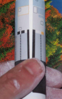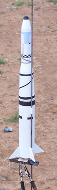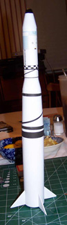Another decision had to be made at this point. The instruction recommend that addition of one additional circumference of black wrapping around the top of the lower BT. This is not in accordance with the correct color scheme but is recommended to hide the sooting caused by ejection charges. I elected to give it a try. I wish I had not as the rocket looks better without it but it is not objectionable. A bit of black paint was applied to the tip of the NC and the end was in sight.