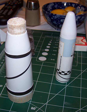 After waiting, I had an upleasant realization about the Kilz. The reason it works as well as it does as a filler is that it puts a lot of "stuff" out. That means that the painted rocket, especially with all those coats, has a larger diameter than would otherwise be the case. That in turn means that the beautiful wraps for the top BT do not fit.