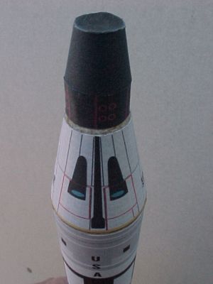 Dust a light coat of black or grey paint onto the top of the balsa stage coupler before attaching the tank top. The tank top doesn't reach the edge of the stage coupler and black or grey looks better here in my opinion than bare balsa. Similarly, paint the balsa disc before fitting it into the bottom of the payload compartment.