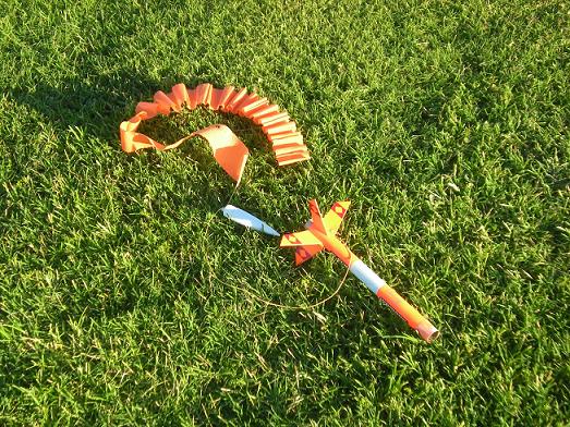 This was for the NARTREK Bronze Streamer Duration requiremment. Flew twice and best was 36 seconds. Attached parachute with Kevlar cord to fin. Really helps keep it up longer...