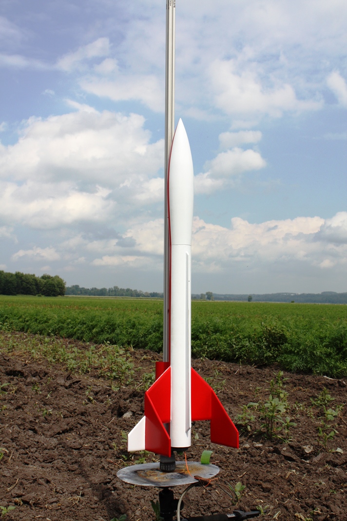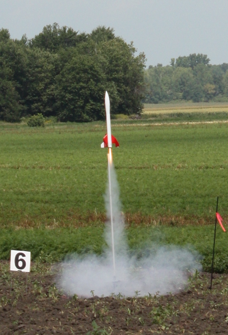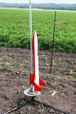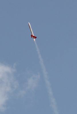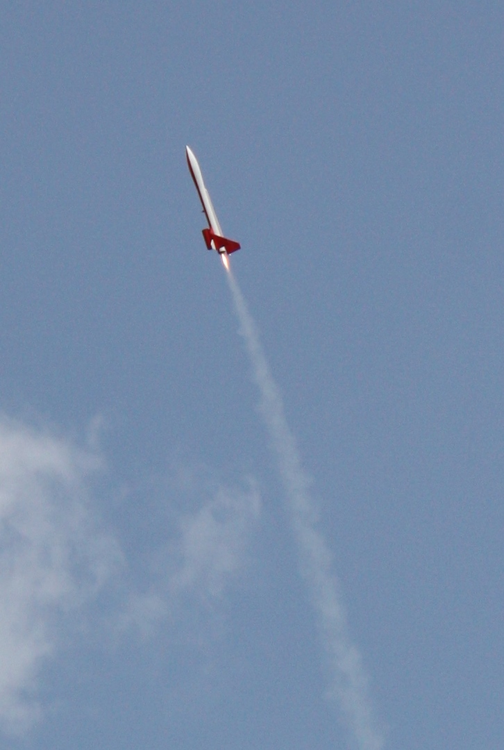 After building a clone, I decided an upscale was in order. The nose cone and decals came courtesy of Sandman. The rest was modeled in Rocksim to make sure it would all work together. The wings/fins are 3/16" light ply, and the rudders and tip winglets are finger tabbed together (like a drawer) to improve the joint strength. The dorsal raceway is 3/16" basswood, and the "faux" engine pod is a #200 tube on a tabbed 3/16" ply pylon. It has a 29mm mount and uses an Estes screw-on motor retainer. Recovery is 3/8" flat elastic on a kevlar leader, with a 30" Topflight parachute.