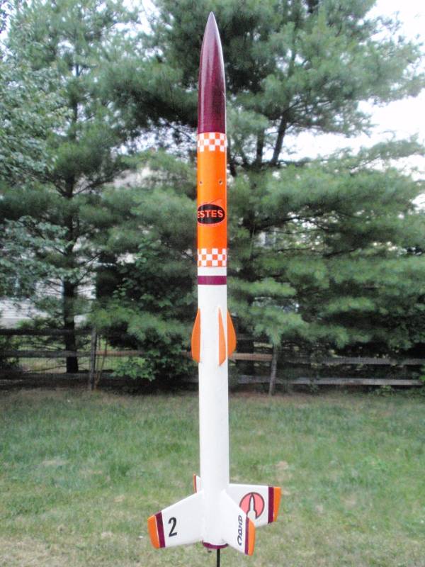 EAC Viper with Iris PayloadThe 2nd kit I built back in 1975. Good ol' number 2. It's a shame to have to mess with the looks of the classic Viper, but I thought this orange payload tube with ESTES decal retains the spirit of the EAC Viper. It still looks mean. The white checker wraps were used to try and blend the design so the orange payload didn't look so out of place. Plain old white would have looked too empty. |