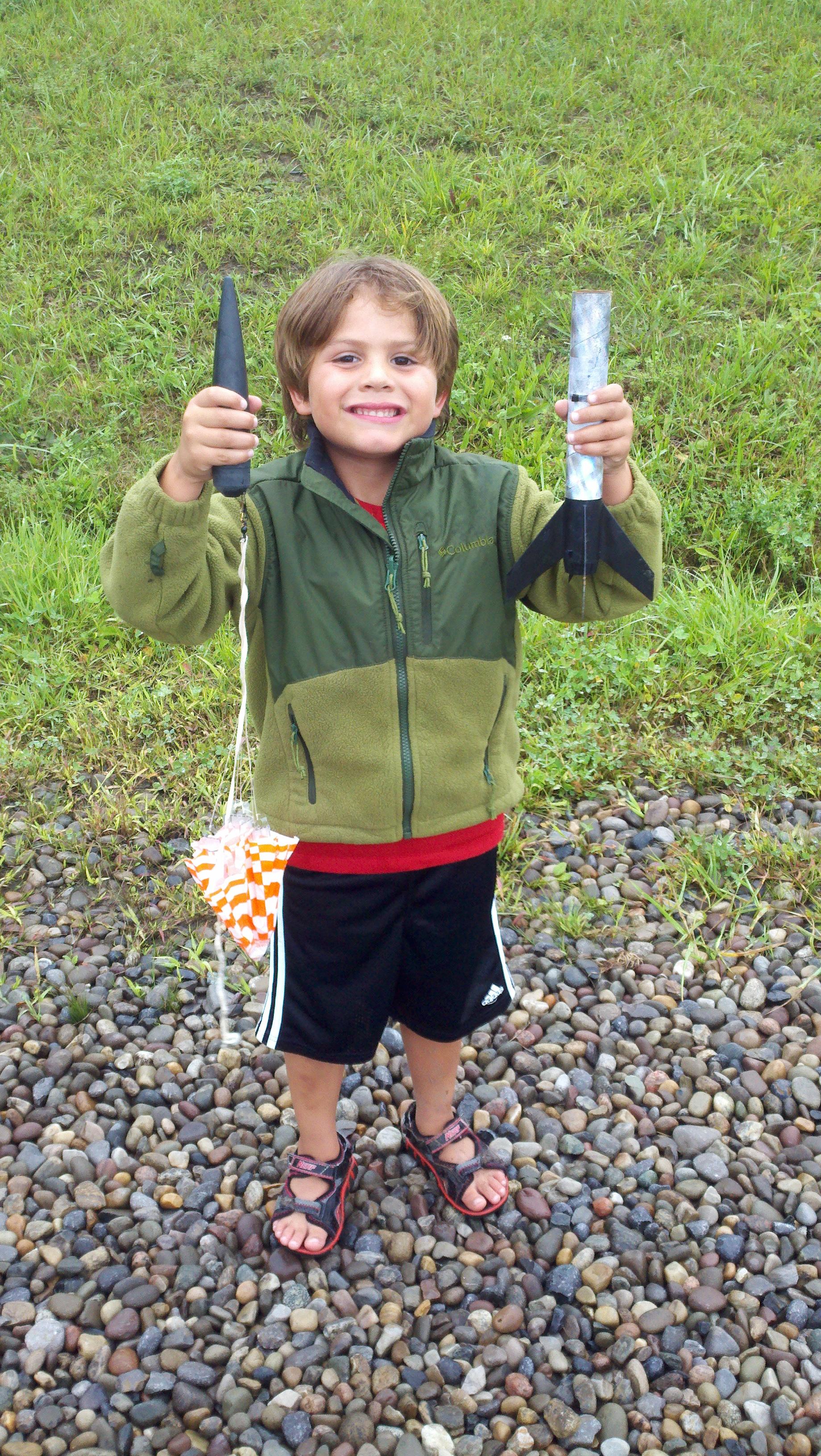 Her last flight took place in the last day of summer, in a steady rain. Her original elastic shock cord had finally burned through, and she came down in two pieces. Once again she landed near the launch pad, we found all the pieces, and was miraculously recovered. From that day forward, this rocket is named the "Mystery Unit", and as of 5 September 2011, on Labor Day, she is officially retired. When I build a display rack, she will be placed in a position of honor in memory of many flights, on so many sunny days. Despite the vicissitudes of fortune, and the discomfort of old age, she flew one last time, and she flew well. Perhaps the most important thing you could say about the Mystery Unit is that she made kids happy until her last flight. So it is altogether fitting that, on that last rainy day of summer, after many days of making children happy, she was finally able to rest.