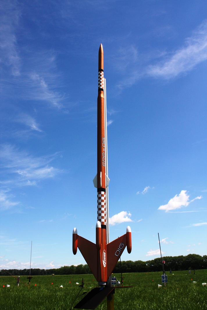 I liked the Estes EPM-010 enough that I decided to build an upscale of it. Deciding that the -010 could be reference to the nearly 1" diameter main tube, the upscale to a BT-60 main tube becomes the EPM-016. Main fins are 1/8" ply, tabbed through to the 24mm mount. The fore fins are balsa, as is the nose cone and transition.