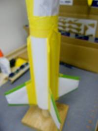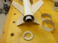 The ring fins were treated similarly (spirals filled, primed, sanded, etc.) and painted the same gray as the nose cone.  These ring fins were installed after all painting on the body was finished (see above and Figure 5).
