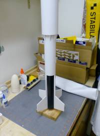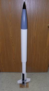 The instructions provided good details on how to finish the rocket.  I filled the tube spirals with water-thinned Elmer's Carpenter's Wood Filler and sanded smooth using 400-grit sandpaper before commencing gluing.  I sanded the plywood fins and coated them with a balsa filler coat and sanded smooth before attaching them to the rocket.  I carefully filetted the fins, strakes, and the eight wedge-shaped pieces that decorate the transition between the 3.0" and 2.25" body tubes.  The rocket was then painted with two coats of KILZ white spray primer, sanding between coats to achieve a smooth surface.  I painted the rocket body gloss white, and the nose cone gray.  To match the paint scheme provided with the instructions, I then painted the top 3 inches of the nose cone black, and painted black roll patterns between the fins and strakes on opposite sides of the rocket body (see Figures 3 and 4).