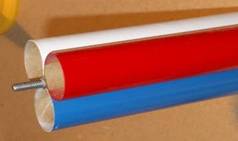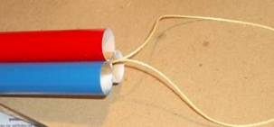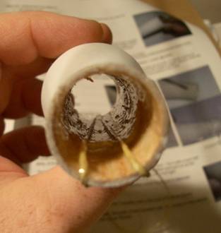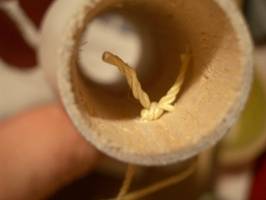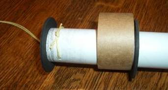 First a coupler is built to mate with the upper body section. The directions call for using a three-fold shock cord mount to attach the Kevlar anchor loop. The force on this rear-ejection design may be much larger than a normal front-blow design, so I wanted to do something a bit beefier. Before I glued the coupler together, I poked two holes in the body tube 180 degrees apart and passed the ends of the Kevlar string through them. Then I knotted them together and finished constructing the coupler. I covered all the thread hidden in the coupler with epoxy to keep the knot from slipping and to spread the force over a larger area.