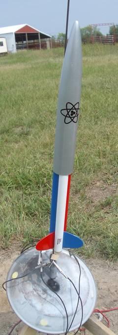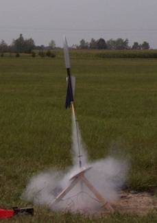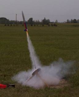 The first flight was beautiful. Fast straight takeoff, perfect ejection at apogee, perfect chute deployment. Drifted about 800 feet, just missing a row of tall pines, and landed gently in tall grass. No damage, no scorching not even on the bottom of the parachute cup. Excellent!