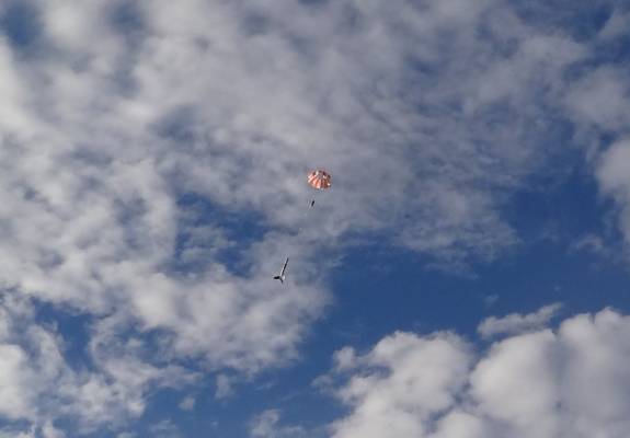 Awesome flight and recovery. Got a pic of it passing the flag during recovery. Great rocket/motor combo for this field.
